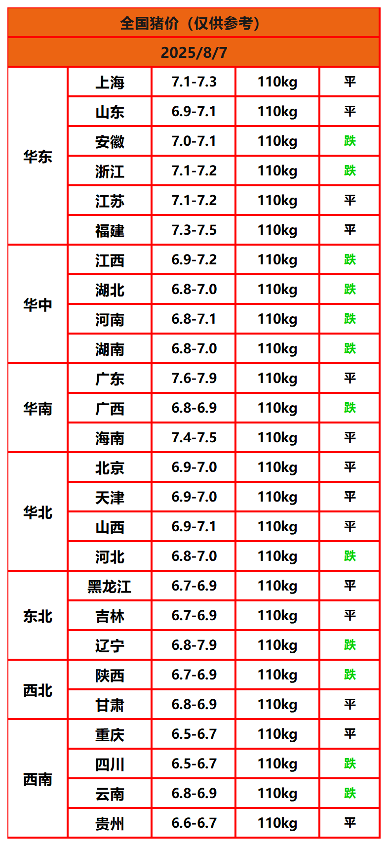 2025年8月7日猪价,今日全国猪价行情走势:0涨14平12跌。
