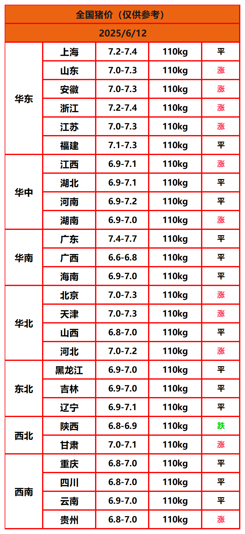 2025年6月12日猪价,今日全国猪价行情走势:11涨14平1跌。